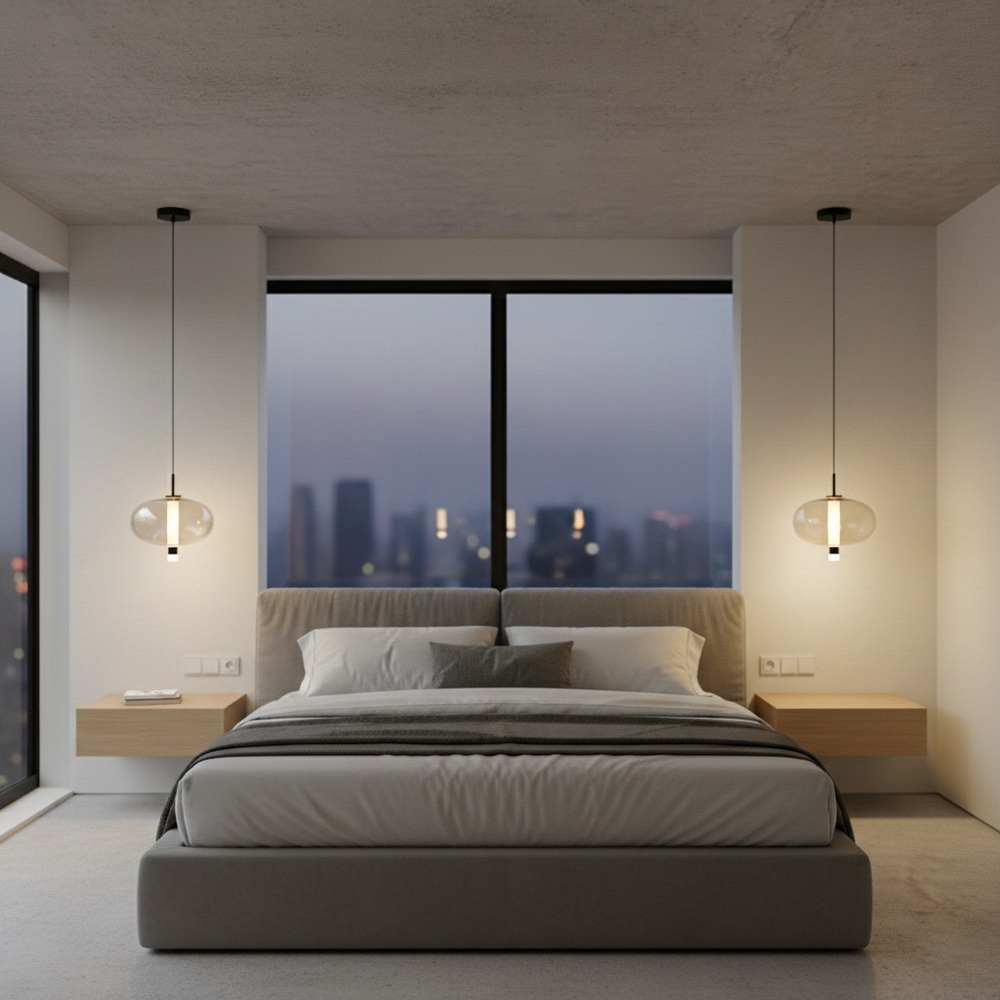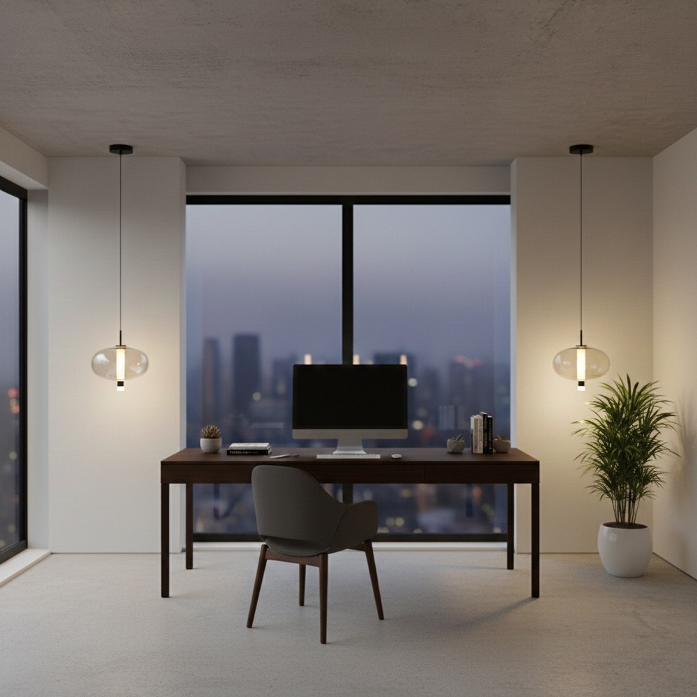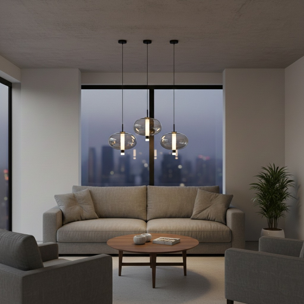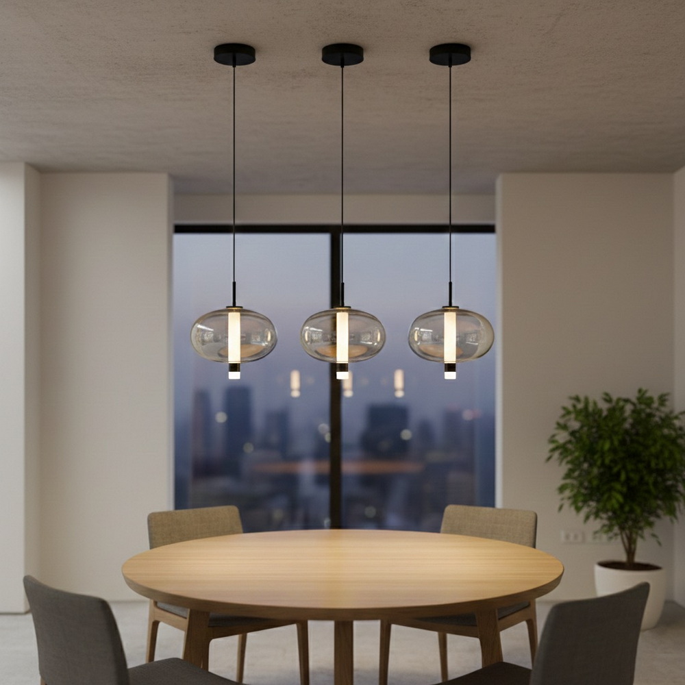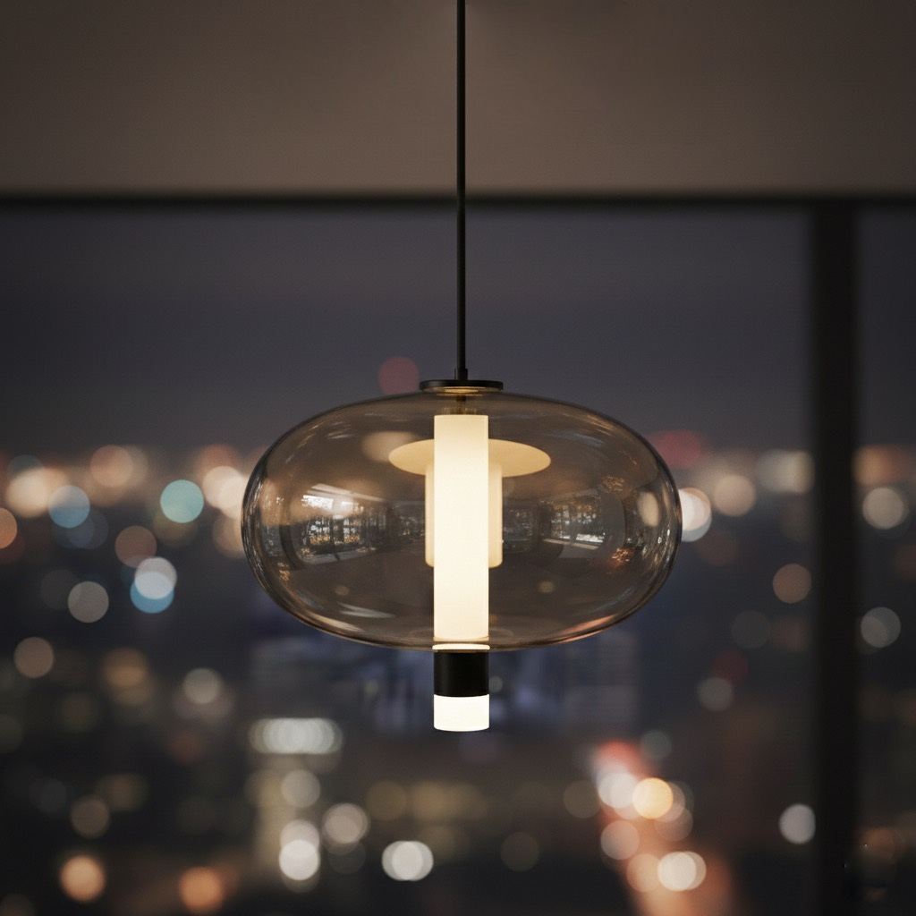 The built-in LED light source ensures even lighting and energy efficiency. The central luminous element combined with the transparent volumetric shade creates a visually light and elegant appearance. Black fittings add a modern touch and enhance the contrast of materials.