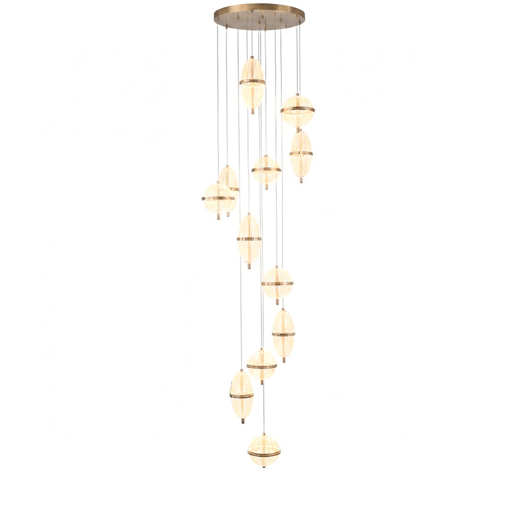 Каскадна світлодіодна люстра на 12 підвісів у вишуканому золотому кольорі — це ефектний дизайнерський світильник, створений для інтер’єрів, де важливі розкіш, легкість та виразна світлова архітектура. Багаторівнева конструкція формує динамічний об’єм, нагадуючи світловий водоспад, який красиво заповнює простір і візуально підкреслює висоту приміщення.