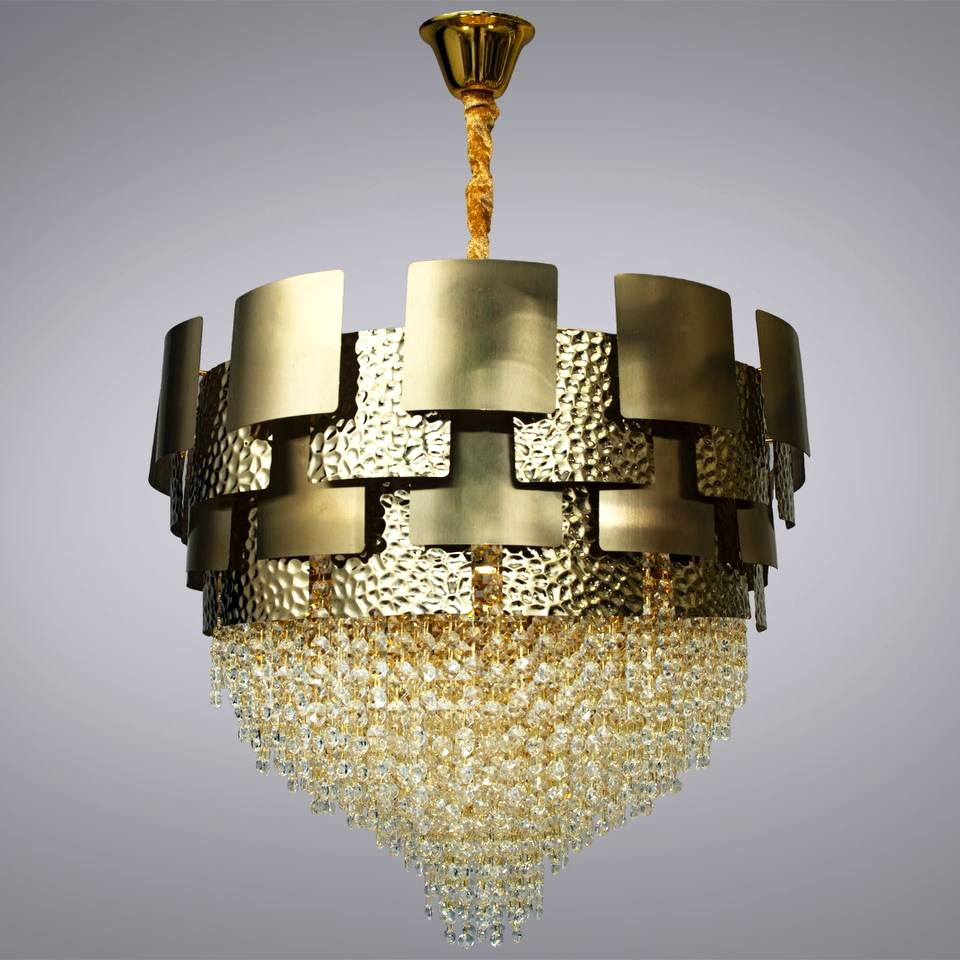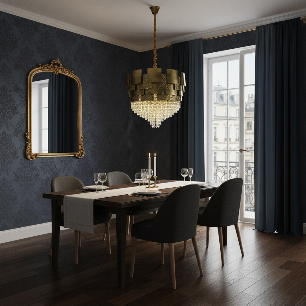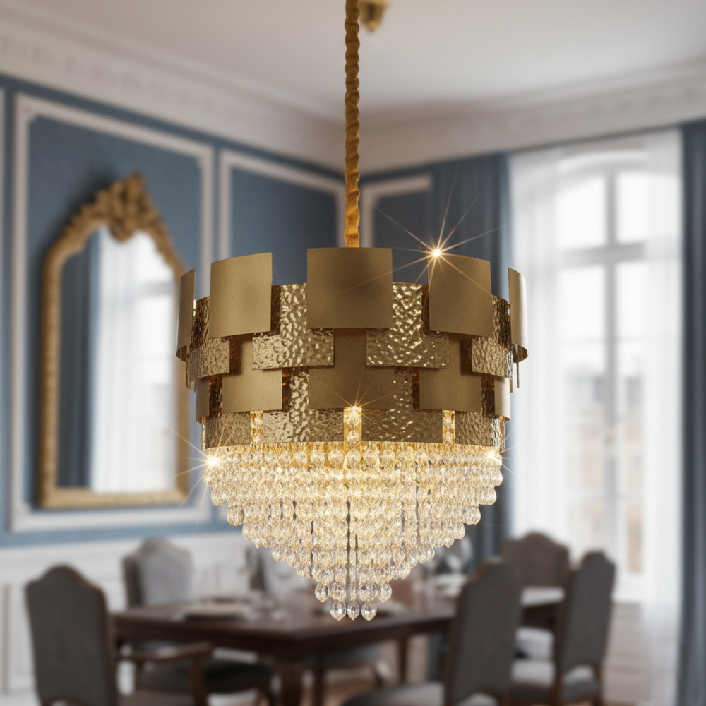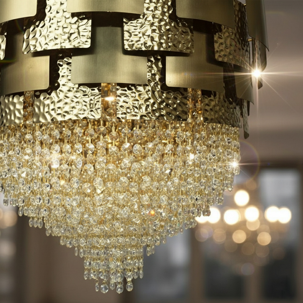 Теплий відтінок бронзового золота надає люстрі вишуканості та чудово поєднується з інтер’єрами у стилі класика, арт-деко чи неокласика. Кришталеві підвіски підсилюють світловий потік і додають простору глибини та гри відблисків. Така люстра стане ефектним акцентом у вітальні, спальні чи над обіднім столом, підкреслюючи статус і бездоганний смак господарів.