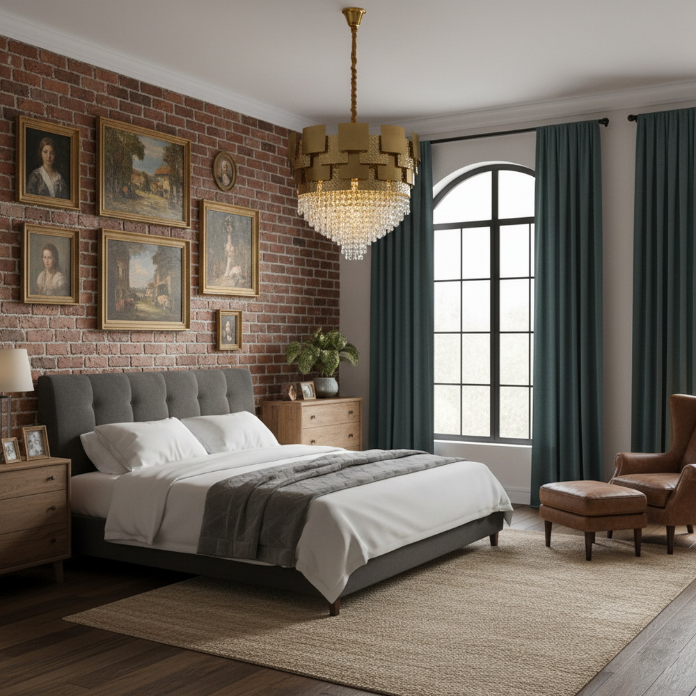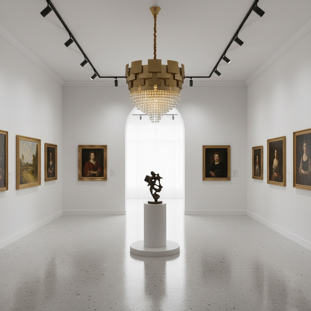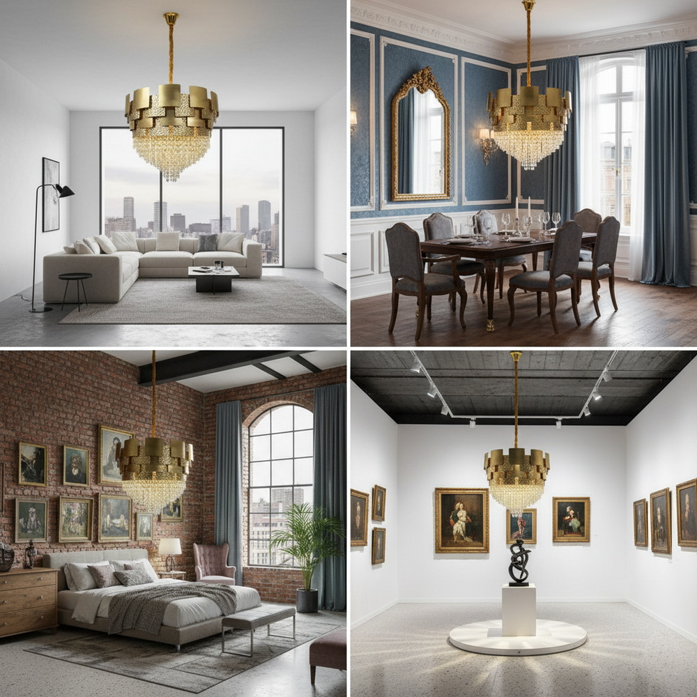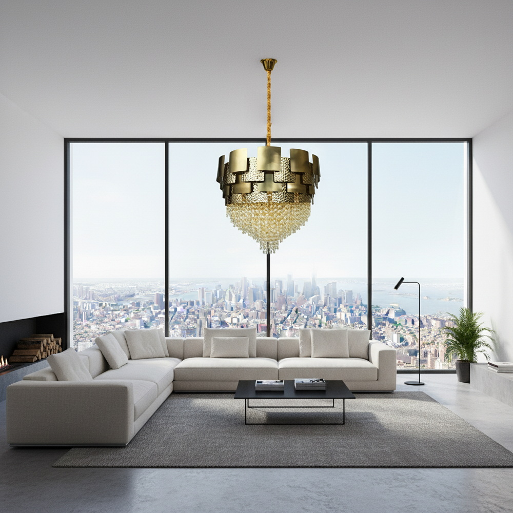 Теплий відтінок бронзового золота надає люстрі вишуканості та чудово поєднується з інтер’єрами у стилі класика, арт-деко чи неокласика. Кришталеві підвіски підсилюють світловий потік і додають простору глибини та гри відблисків. Така люстра стане ефектним акцентом у вітальні, спальні чи над обіднім столом, підкреслюючи статус і бездоганний смак господарів.