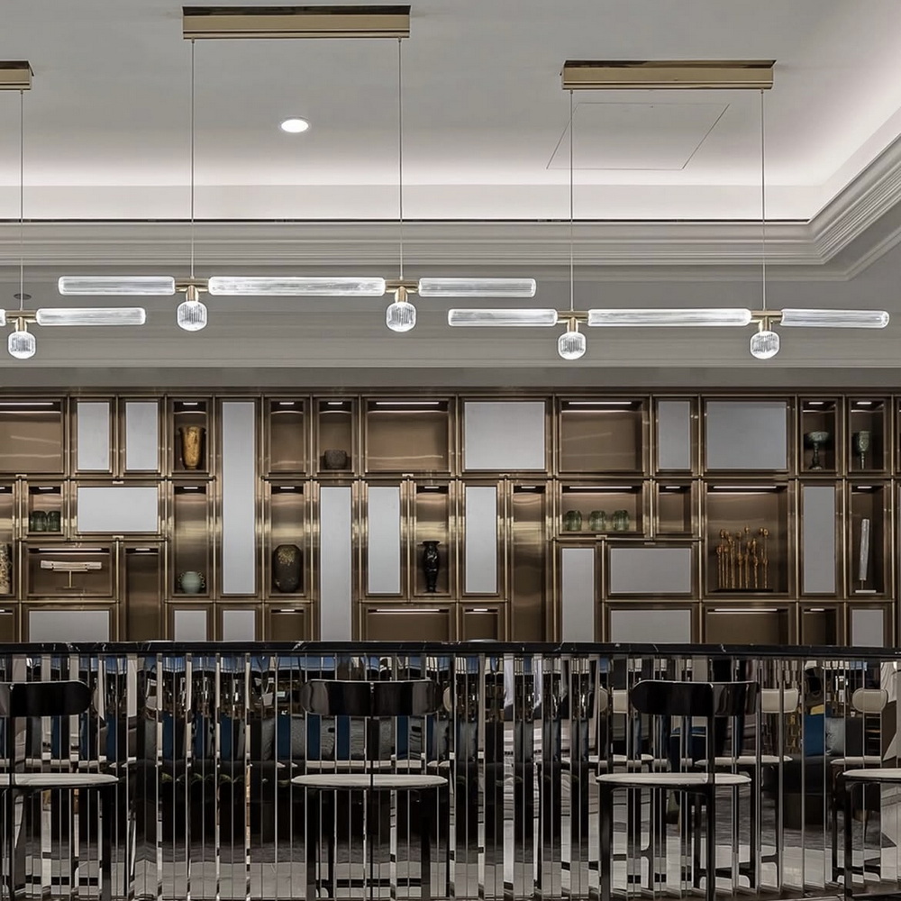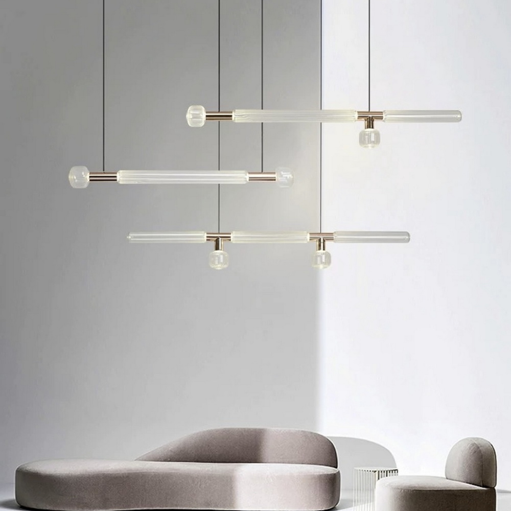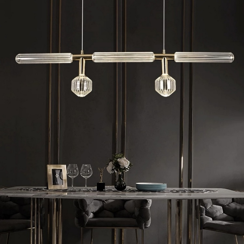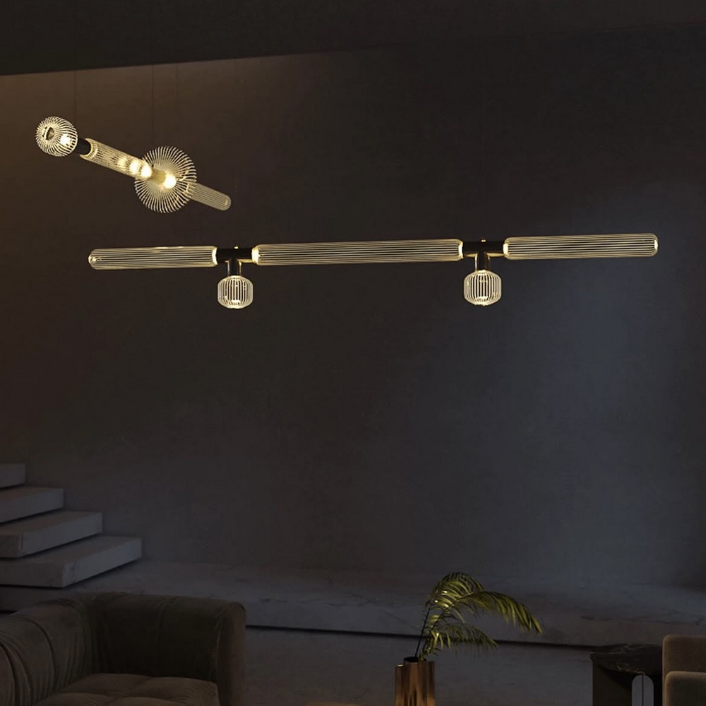 Світлодіодна люстра з прозорого скла в бронзовому золоті — це поєднання витонченого дизайну та сучасних технологій освітлення. Подовжена форма довжиною 114 см створює елегантний акцент над обіднім столом, у вітальні або просторому холі, додаючи інтер’єру гармонії та легкості. Прозорі скляні елементи м’яко відбивають і розсіюють світло, наповнюючи простір теплом і затишком.