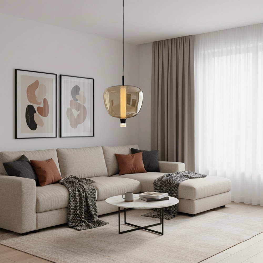 Такий підвіс чудово виглядає як окремий елемент, так і в композиції з кількох світильників — над барною стійкою, обіднім столом чи робочою зоною. Сучасний, стильний і функціональний світильник, який легко впишеться в будь-який інтер’єр та підкреслить теплу атмосферу вашого дому.