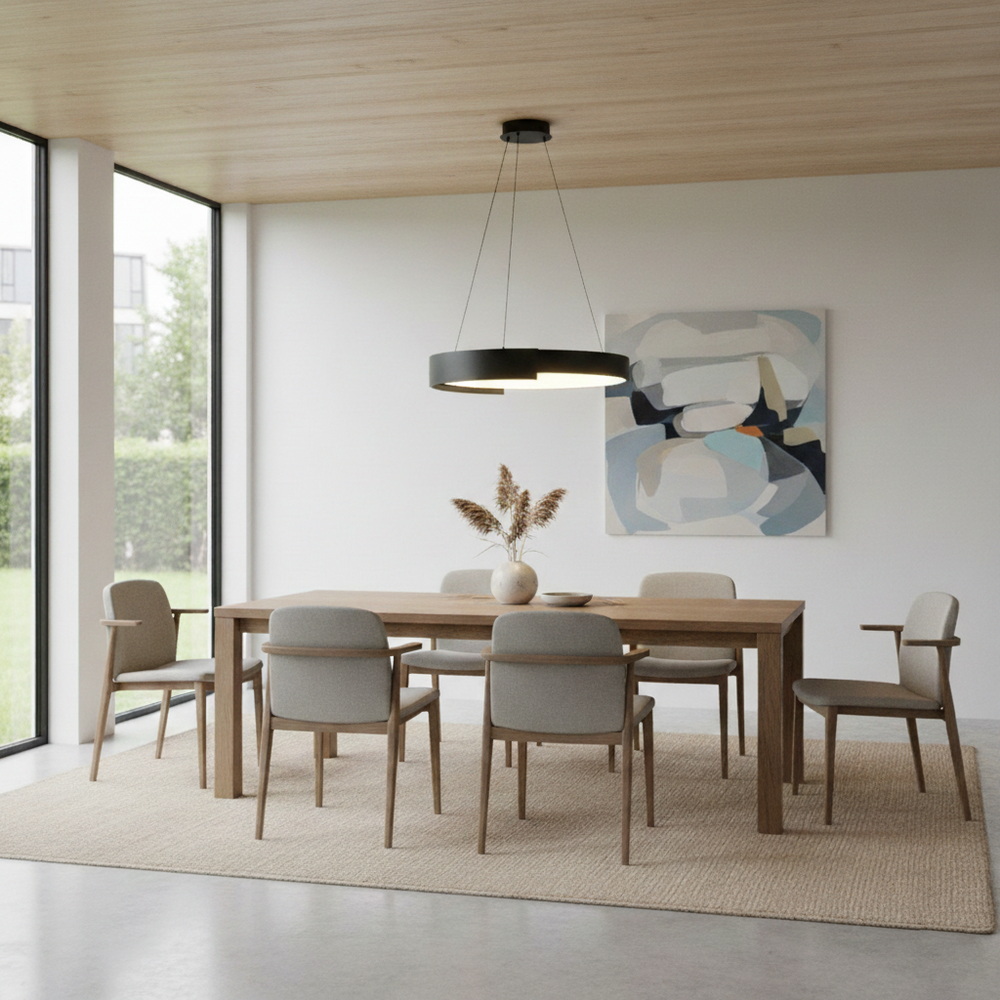 Підвісна конструкція на тонких тросах створює відчуття легкості та сучасності. Завдяки регульованій висоті підвісу світильник можна легко адаптувати до різної висоти стелі та планування приміщення. Особливо ефектно він виглядає над обіднім столом, кухонним островом або в центрі кімнати.