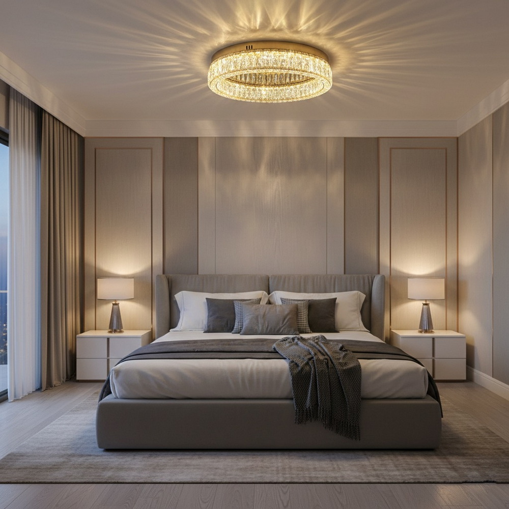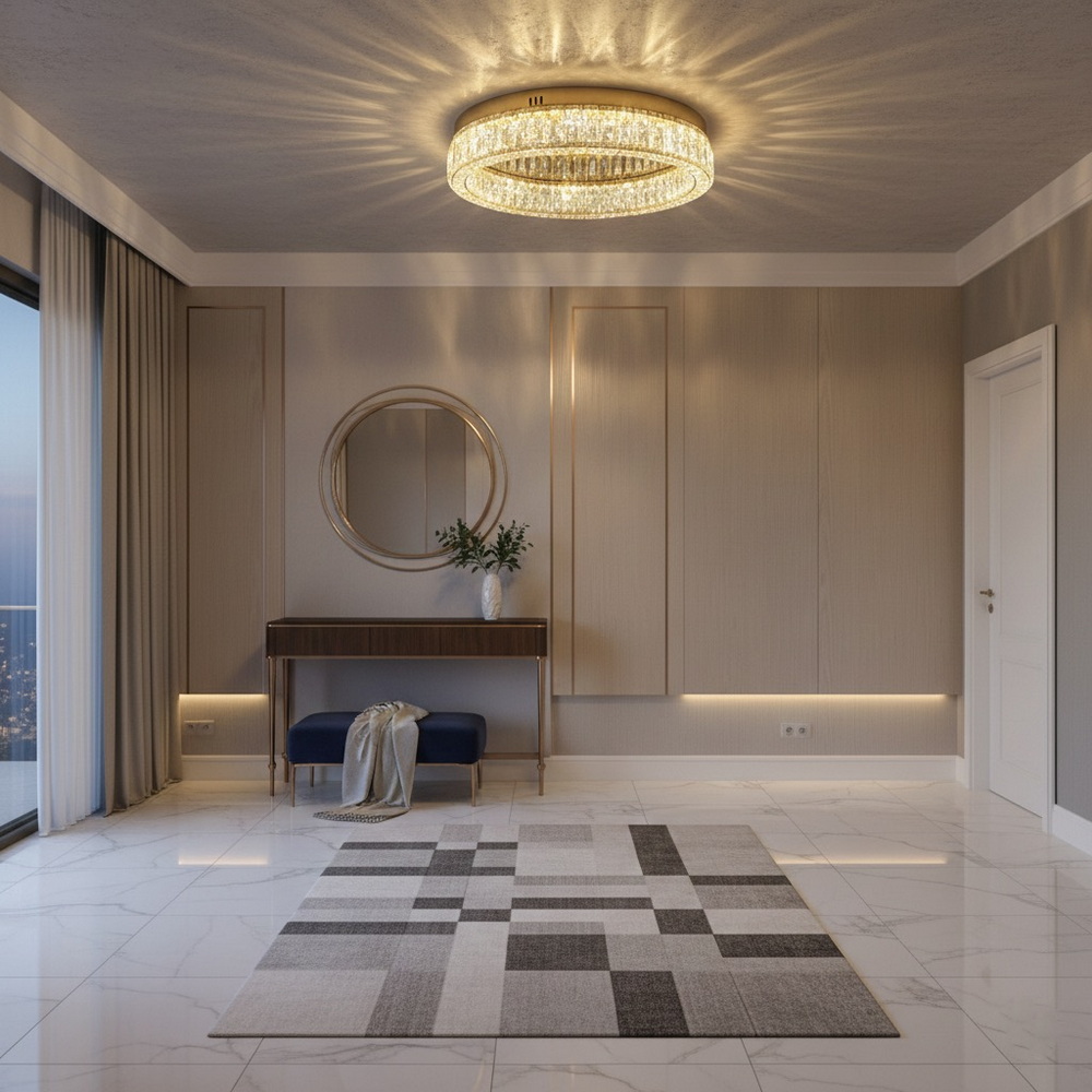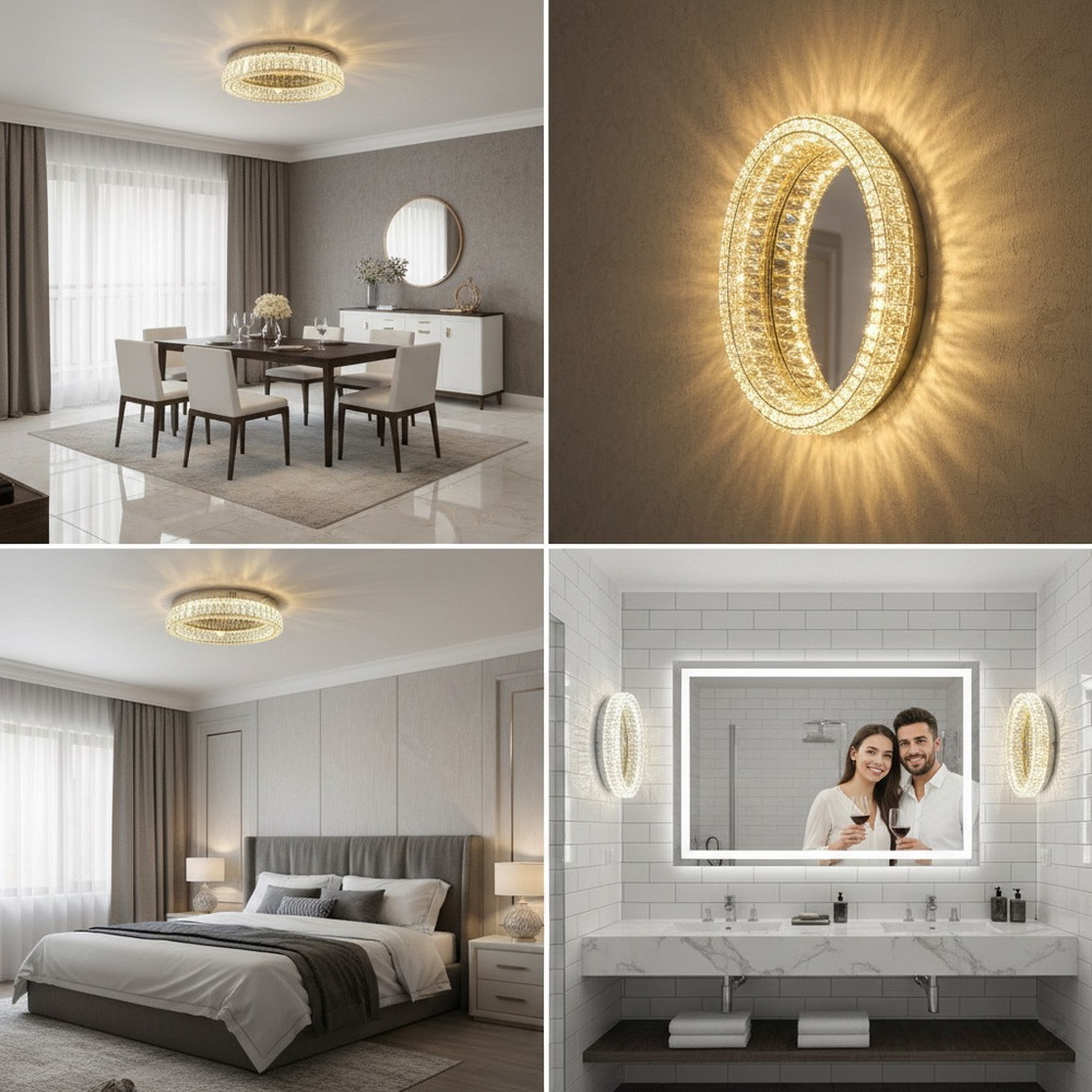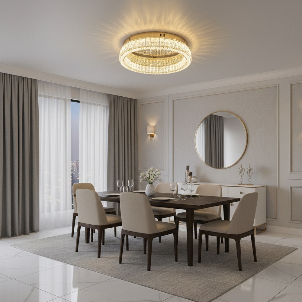 Стельова світлодіодна люстра діаметром 50 см із кришталем у золотому кольорі — це стильне та ефектне рішення для сучасного інтер’єру. Модель виконана у формі об’ємного кільця, що створює відчуття легкості та візуальної глибини, забезпечуючи при цьому потужне та рівномірне освітлення. Люстра гармонійно поєднує блиск полірованого металу у відтінку золота та сяйво огранених кришталевих елементів, формуючи розкішну гру світла на стелі та стінах.