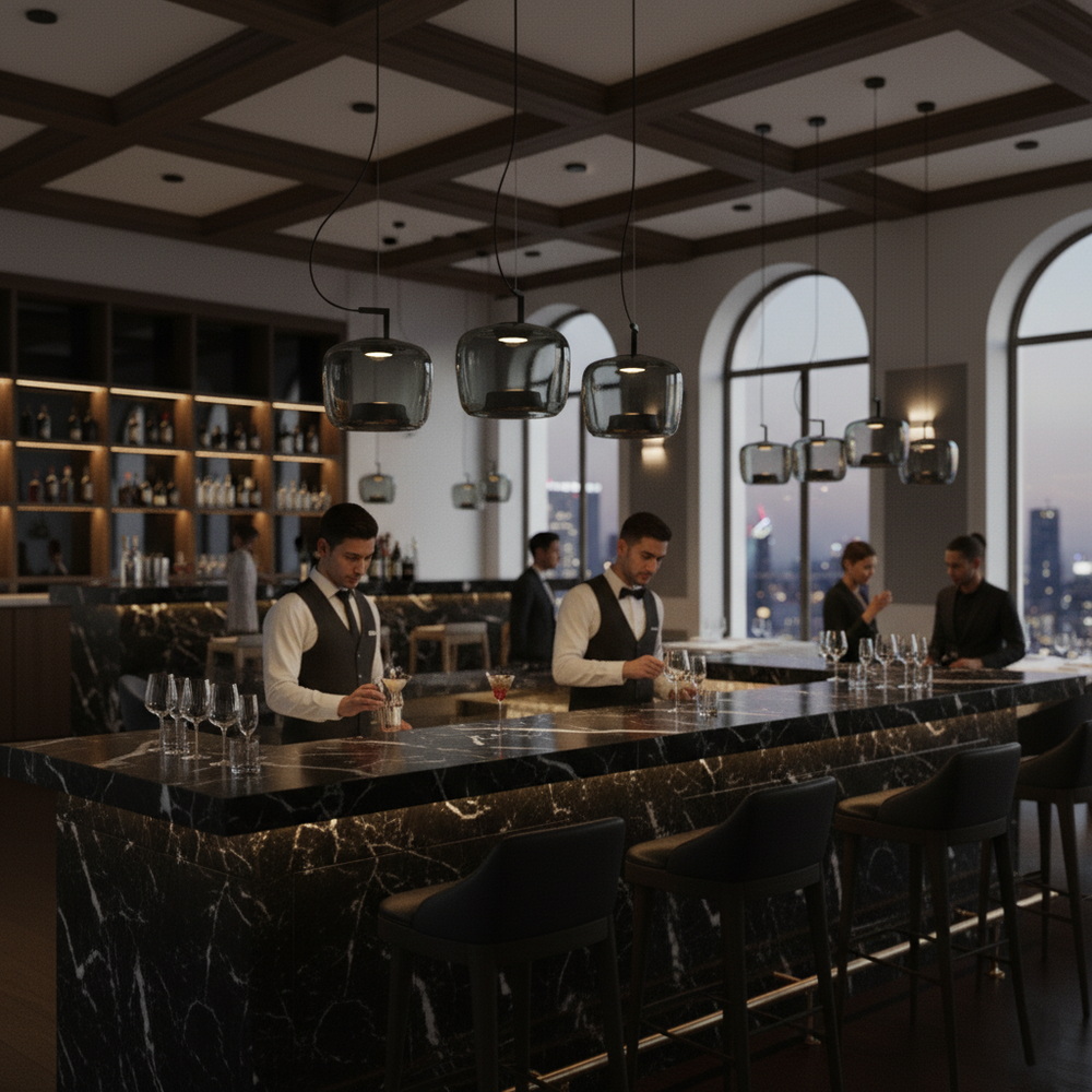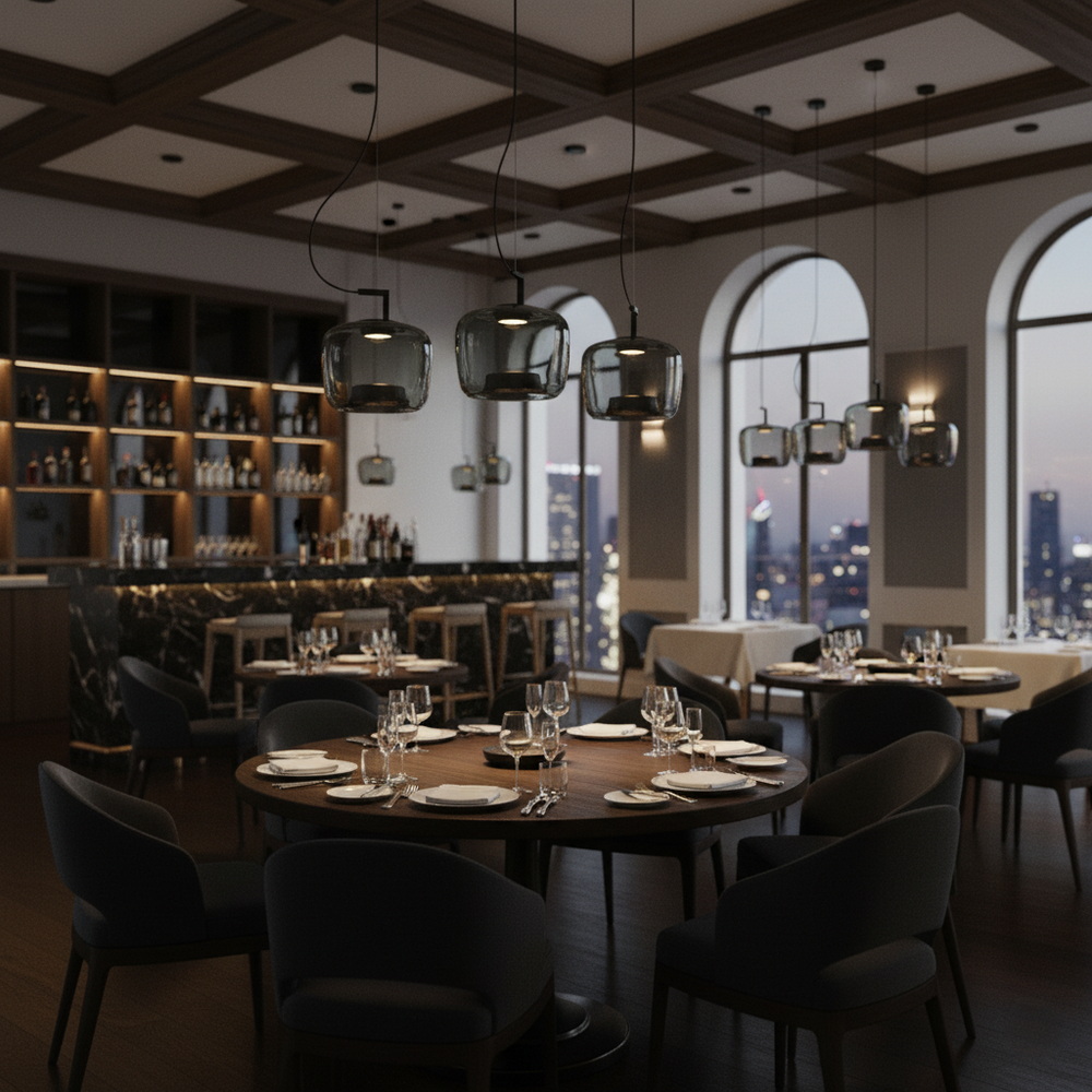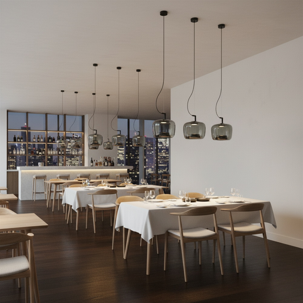 Світлодіодна технологія забезпечує значне зниження енергоспоживання та довговічність світильника. Завдяки рівномірному розсіюванню світла через графітове скло, підвіс створює комфортне освітлення без відблисків і тіней, що робить його ідеальним для житлових приміщень — від кухні до спальні, а також для комерційних просторів.