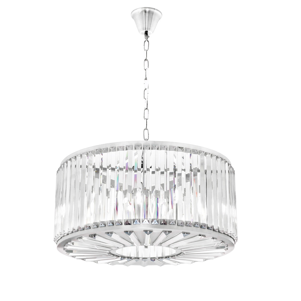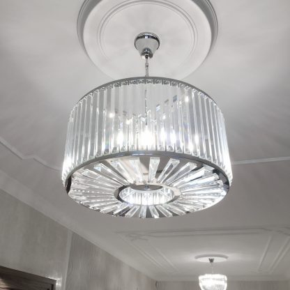 Элегантная люстра на 12 лампочек в хроме – это стильное и функциональное решение для освещения просторных интерьеров. Модель выполнена в цилиндрической форме с диаметром 60 см, что делает её гармоничным акцентом в гостиной, столовой, спальне или представительском помещении. Хромированное покрытие придаёт люстре современный блеск, отражает свет и визуально расширяет пространство, создавая атмосферу уюта и роскоши.