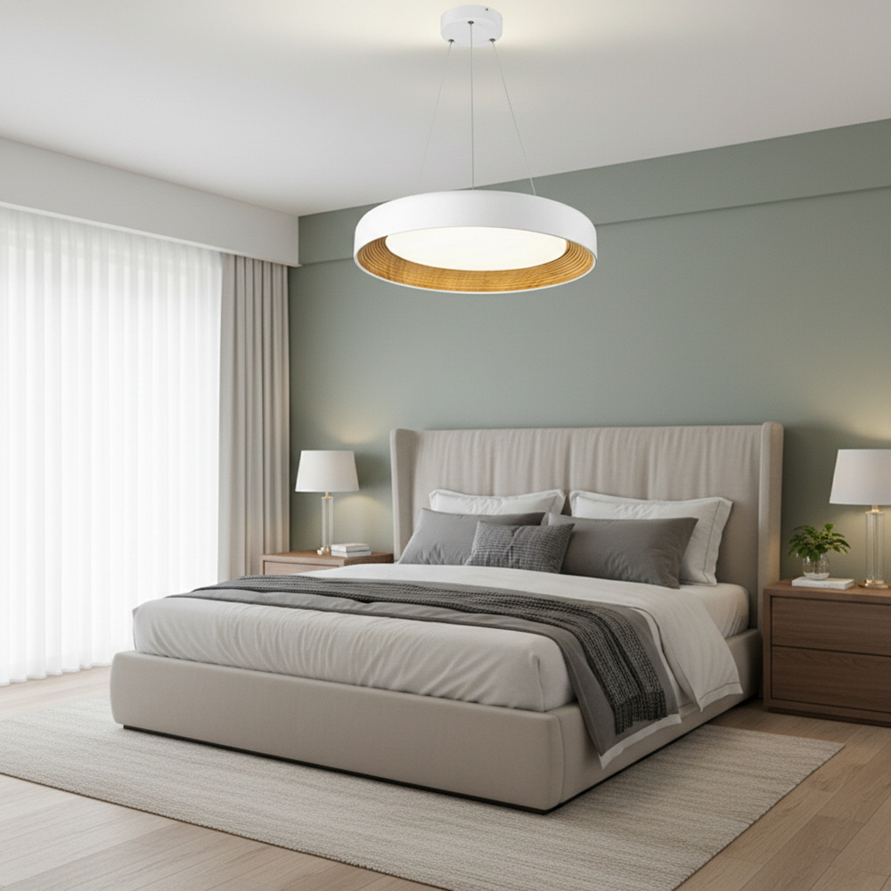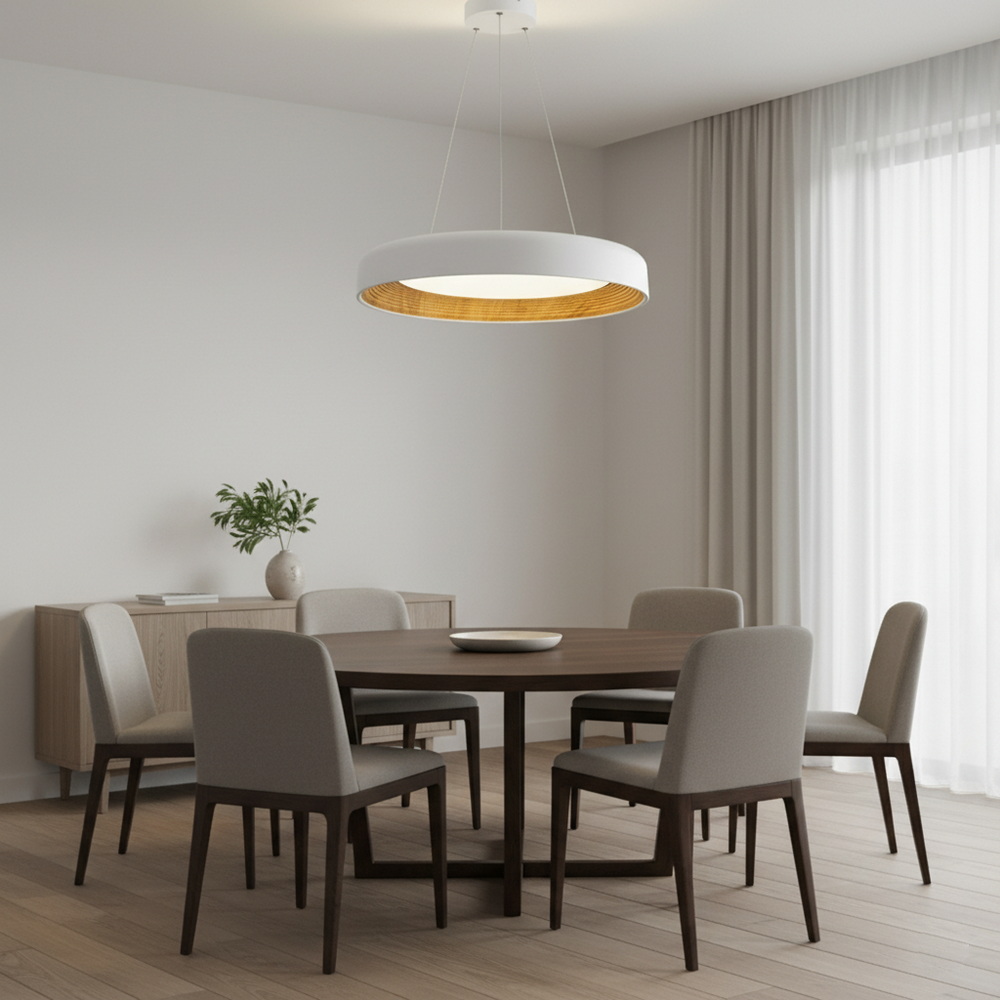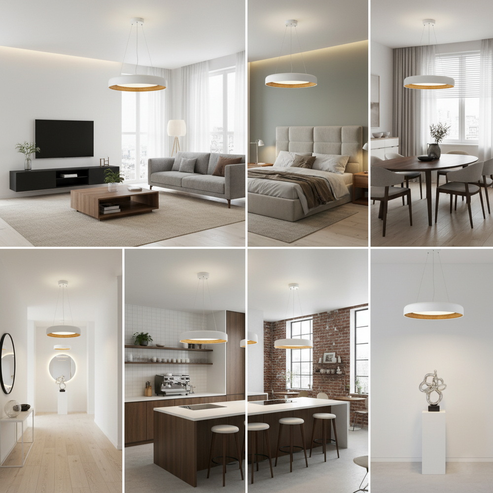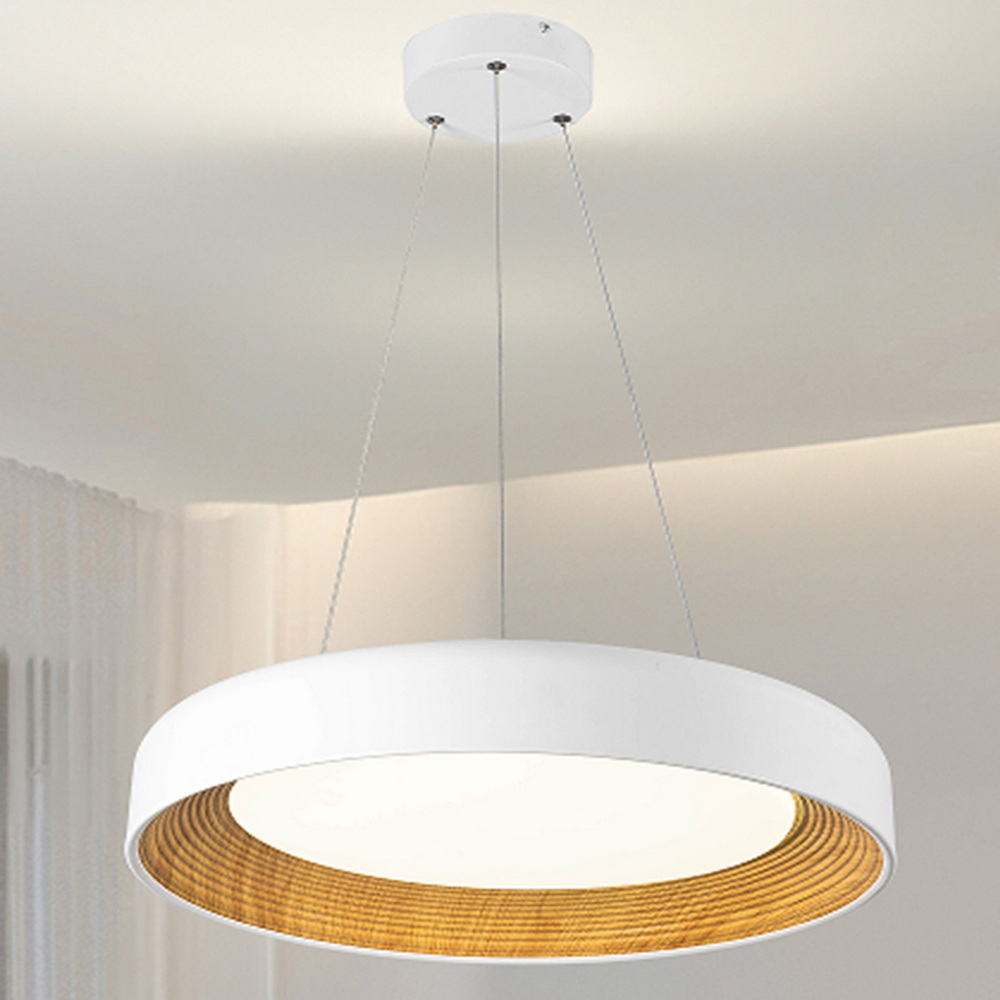Белый корпус гармонично сочетается с любыми цветовыми решениями интерьера — от светлых скандинавских пространств до контрастных современных помещений. Благодаря диаметру 50 см, люстра подходит как для основного освещения комнат средней площади, так и для акцентного освещения обеденной зоны или спальни .