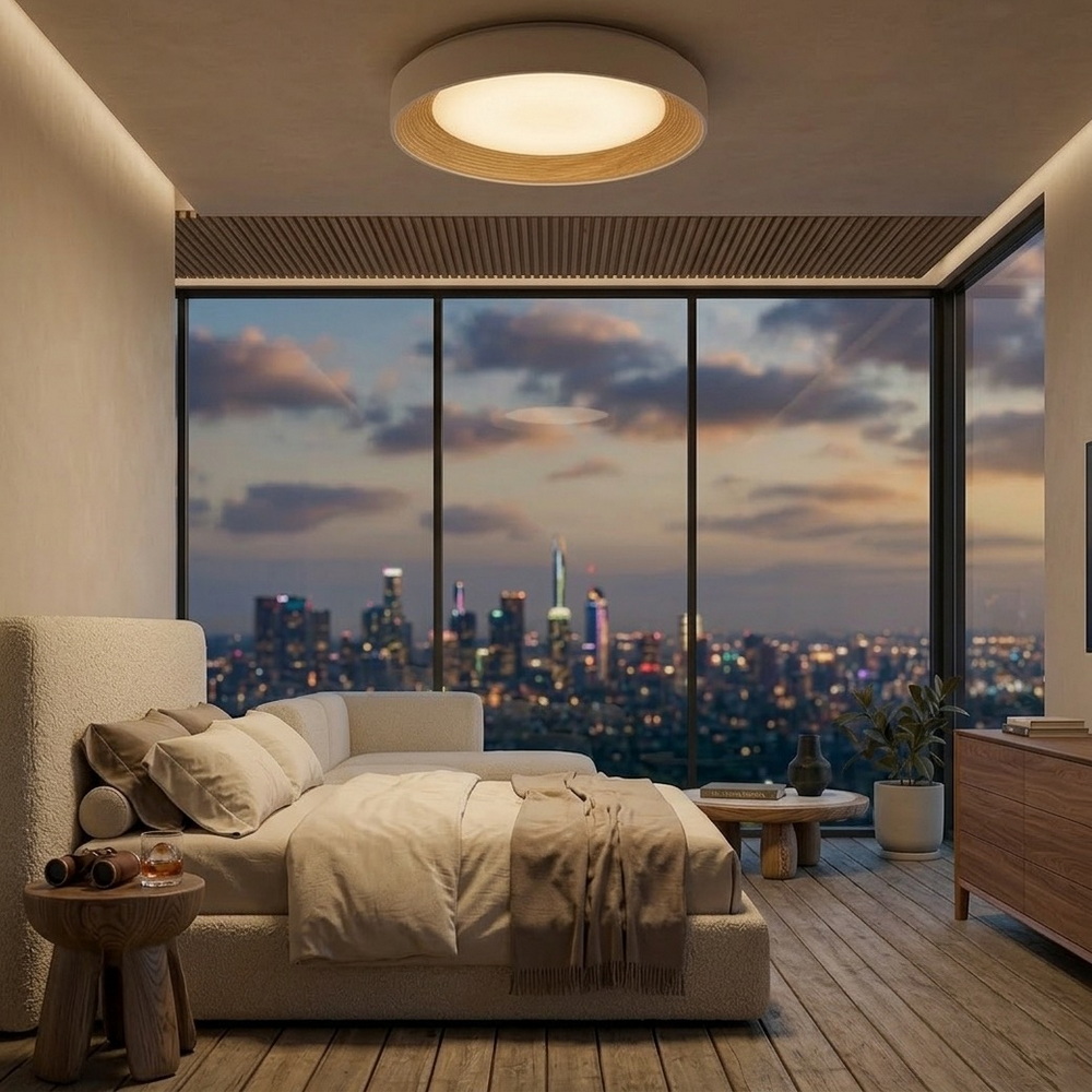 Плоская потолочная конструкция делает светильник особенно удобным для помещений с невысокими потолками, визуально сохраняя пространство и создавая ощущение лёгкости.