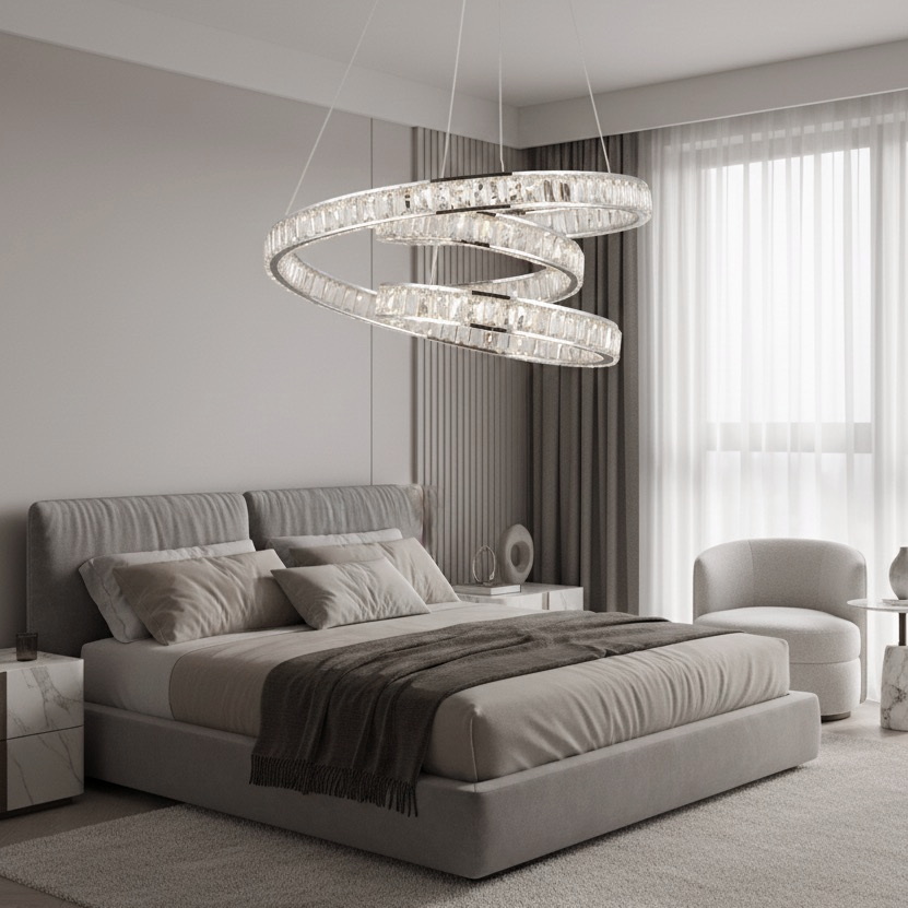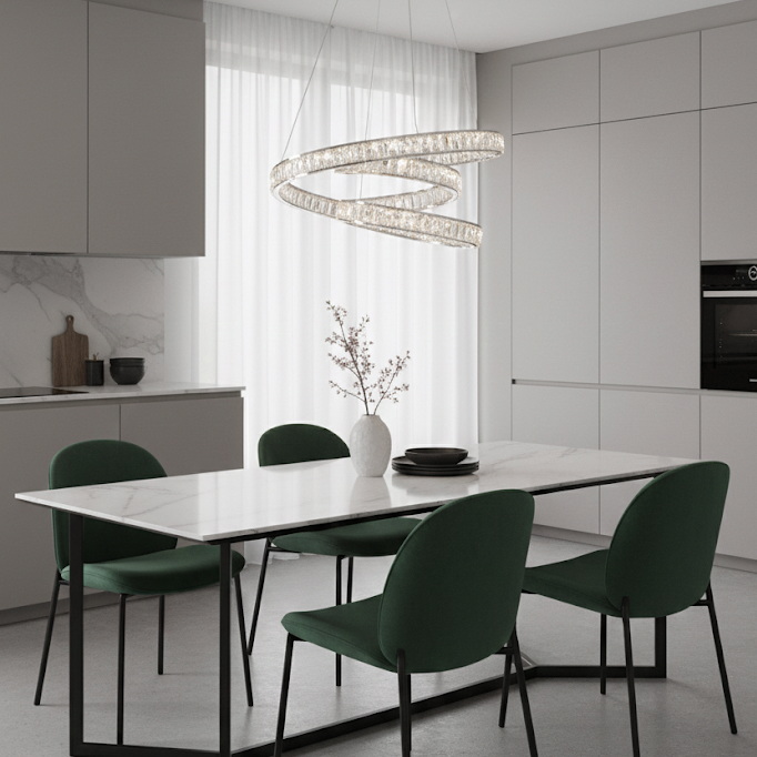 Хромированная основа усиливает сияние хрусталя, подчёркивая чистоту линий и визуальную лёгкость конструкции. Благодаря встроенным светодиодам люстра излучает яркий, но мягкий свет, который равномерно заполняет помещение и делает атмосферу более тёплой и торжественной.
